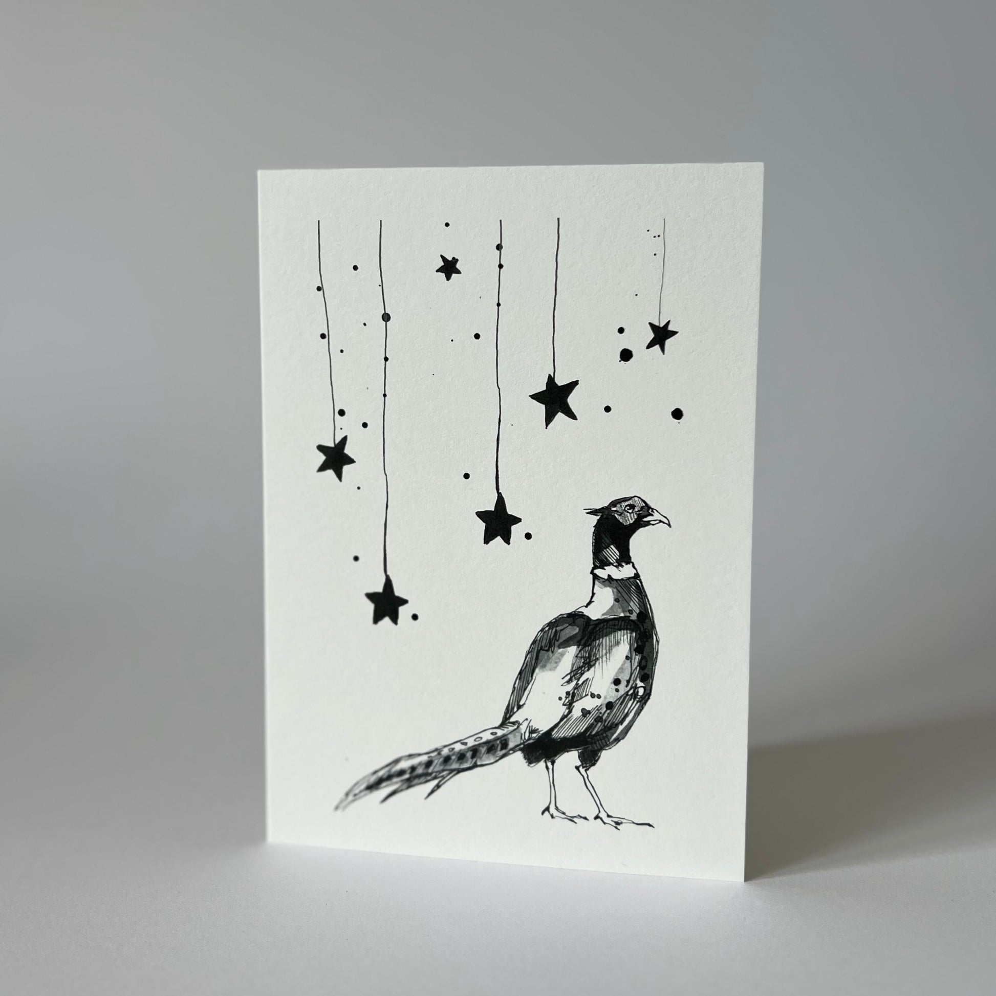 A pheasant under the stars greeting card, designed from original pen drawings by Amy Balch.