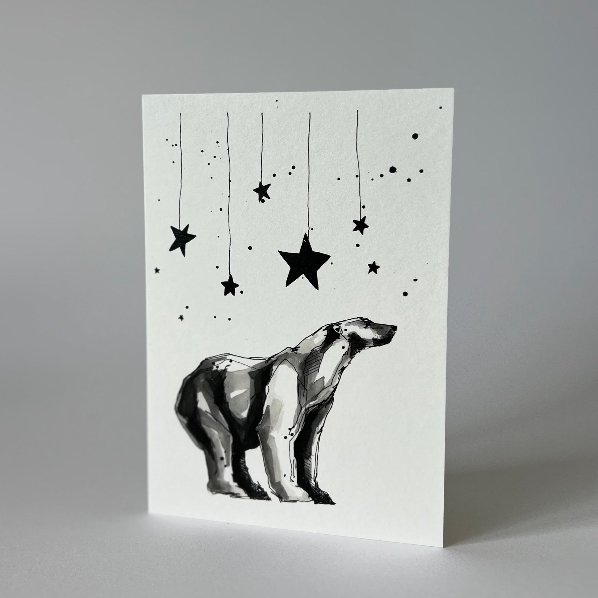 A polar bear under the stars greeting card, designed from original pen drawings by Amy Balch.